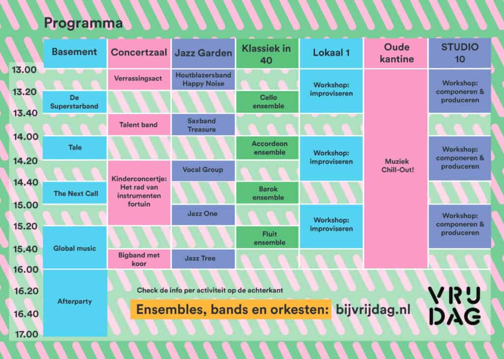 Iedereen kan gratis binnenlopen om even te kijken of de hele middag te blijven. Het kinderconcert Het rad van instrumentenfortuin kost € 7,50 pp (aanvang 14.20 uur), alle overige optredens en activiteiten zijn gratis. Meer informatie: bijvrijdag.nl/muziekfestival. De muziekafdeling van VRIJDAG bevindt zich aan de Sint Jansstraat 7 in Groningen.