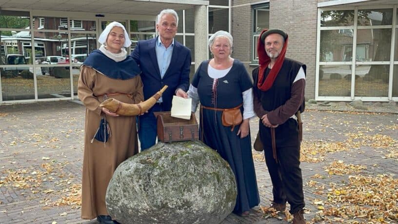 SELLINGEN – In het kader van het eeuwenoude Landrecht van Westerwolde heeft het bestuur van Middeleeuws Ter Apel vandaag op plechtige wijze de Boerhoorn samen met het Westerwolds Landrecht overhandigd aan burgemeester Jaap Velema van Westerwolde. De boerhoorn is een houten hoorn die door de boerrichter gebruikt werd om bijeenkomsten van het volk aan te kondigen, recht te spreken en bij het melden van gevaar. De boerrichter was de boer die in de Middeleeuwen gedurende een jaar het recht sprak volgens het eeuwenoude landrecht van Westerwolde.