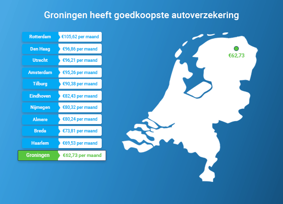Dat blijkt uit onderzoek van de financiële vergelijkingssite Geld.nl. Op basis van 18.000 vergelijkingen van inwoners uit de 10 grootste steden qua inwoneraantal berekende de vergelijkingssite de gemiddelde premie die wordt betaald voor een autoverzekering. In de stad Groningen is de premie met 62,73 euro per maand het laagst. Dit scheelt ruim 500 euro per jaar met Rotterdam, waar de autopremies het hoogst zijn.