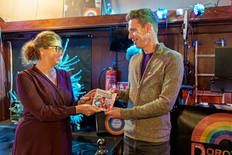 Op Paarse Vrijdag, 13 december, is het Queer Year Groningen 2024 afgesloten met de lancering van de regenboogstadswandeling. Wethouder Diversiteit, Manouska Molema, overhandigde het eerste boekje met de vernieuwde stadswandeling aan Mark Gils, voorzitter COC Groningen en Drenthe.