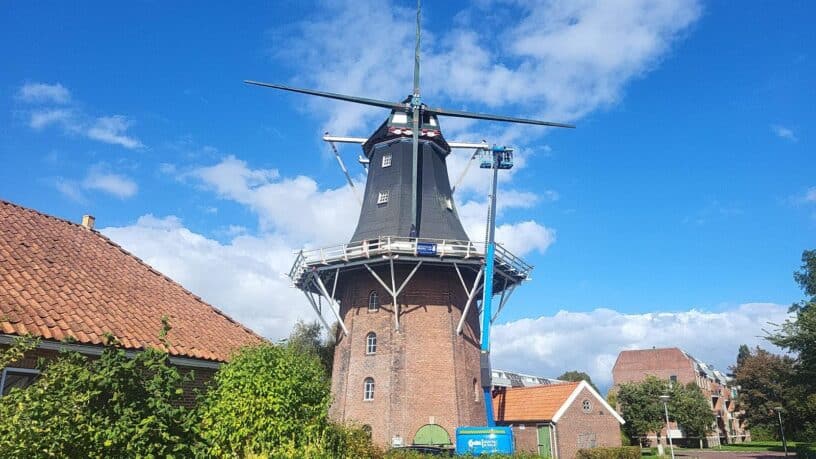 Molenmakersbedrijf Molema uit Heiligerlee is afgelopen week begonnen met de werkzaamheden aan molen Dijkstra in Winschoten. Om bovenin de kap alles te kunnen demonteren, wordt woensdag 24 september vanaf 09.00 uur het wiekenkruis eruit getakeld. Hiervoor is de Irisstraat tijdelijk afgesloten.