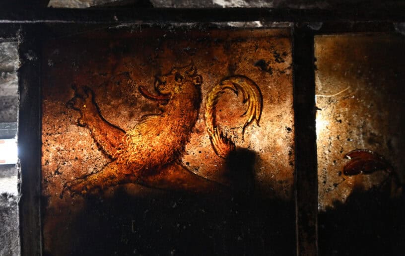 “Dat er ook nog familiewapens in bleken te zitten, maakte het uniek,” gaat Taco verder. “Het raam werd al eerder ontdekt, namelijk in de jaren negentig. Bouwhistoricus Albert Reinstra nam het zelfs op in een artikel dat hij schreef over dit soort vensters. Maar wat zij toen niet zagen, was dat er familiewapens gebrandschilderd in het glas te zien zijn. In beide bovenramen zijn dezelfde wapens geplaatst, de linker is grotendeels bewaard gebleven. Je ziet dit alleen als je er licht achter brengt. Er komt dan een klaver drie tevoorschijn, een bloem, een ranke leeuw en een helm met een vizier.” Van wie de familiewapens zijn, durft Taco niet te zeggen. “Het wordt onderzocht, maar we hebben nog geen aanknopingspunt kunnen vinden.”