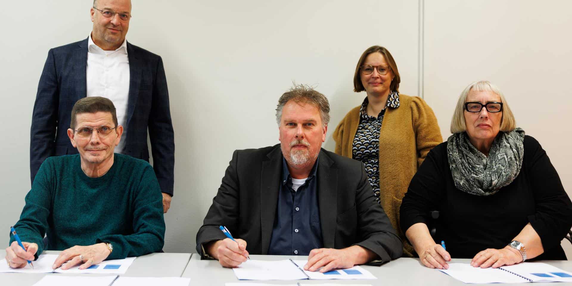 Op de foto. Staand: Henk Fissering (Acantus) en Laura Broekhuizen (Groninger Huis). Zittend v.l.n.r.: Sebo Bakker (Huurdersorganisatie Oldambt), Gert Engelkens (wethouder Wonen gemeente Oldambt) en Marijke Lubbes (Huurdersadviesgroep Groninger Huis).