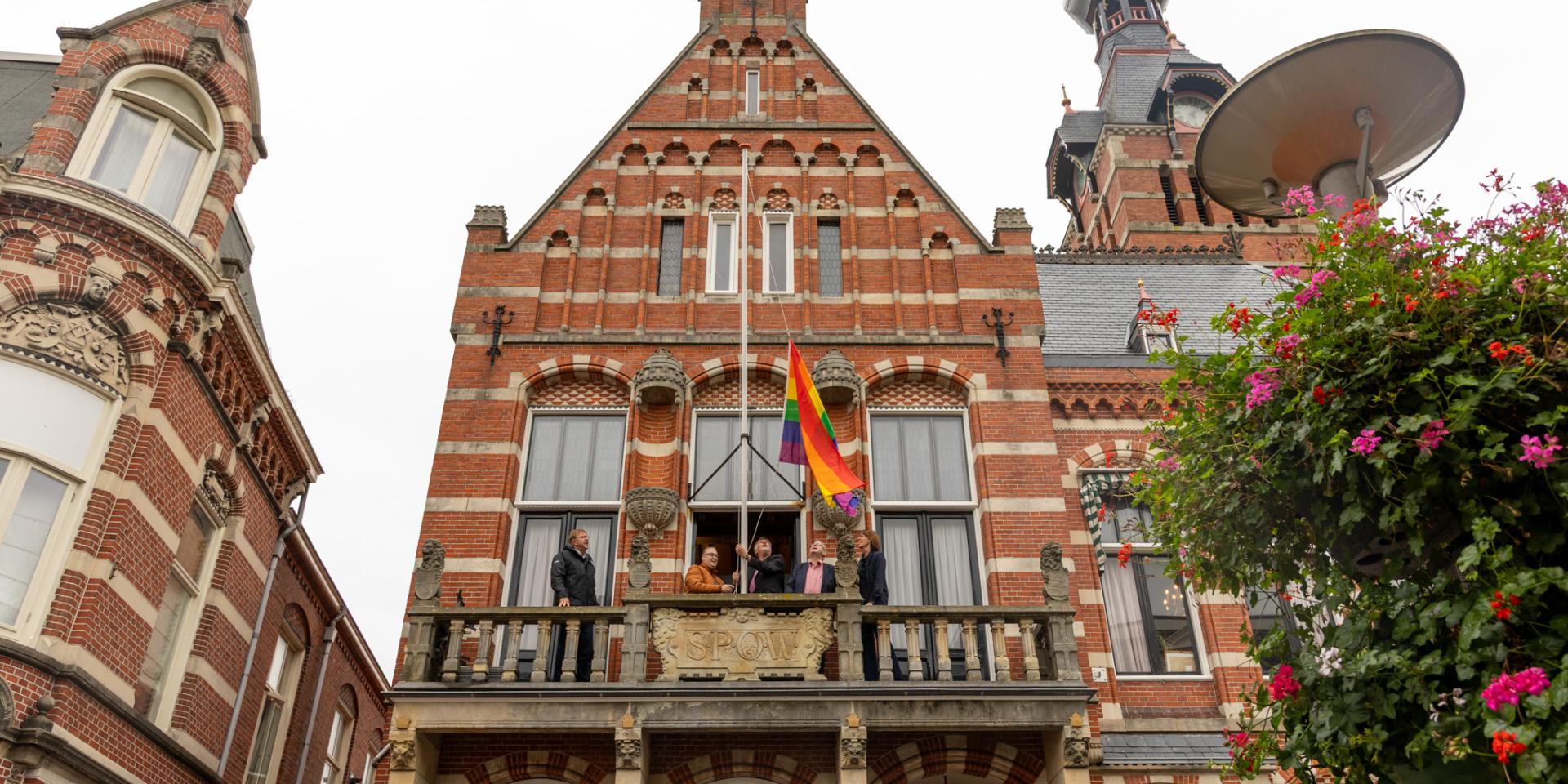 Aan het gemeentehuis in de Langestraat in Winschoten wappert deze week de regenboogvlag. Wethouder Gert Engelkens hees de vlag samen met burgemeester Cora-Yfke Sikkema, wethouders Jurrie Nieboer en Erich Wünker en Harm Tuin, die een persoonlijk verhaal vertelde over zijn ervaringen met homoseksualiteit in de ouderenzorg.