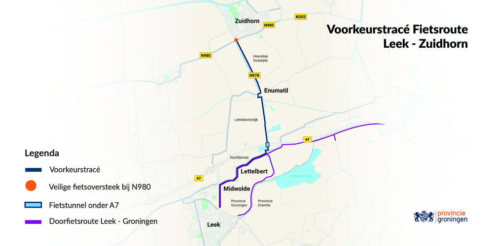 De beoogde route tussen Zuidhorn en Leek volgt voor een groot deel het Hoendiep en Lettelberterdiep. Bij de Fanerbrug, ten zuiden van Zuidhorn, komt een veilige oversteek voor fietsers bij de kruising met de Fanerweg (N980). Langs het Hoendiep Oostzijde komt een vrijliggend fietspad tot aan Enumatil. Het fietspad langs de Lettelberterdijk, tussen Enumatil en Lettelbert, wordt verbeterd en verbreed. Fietsers kunnen vervolgens via een tunnel onder de A7 door, waarna het fietspad aansluit op de Hoofdstraat bij Lettelbert. De Hoofdstraat is onderdeel van de Doorfietsroute Leek – Groningen.