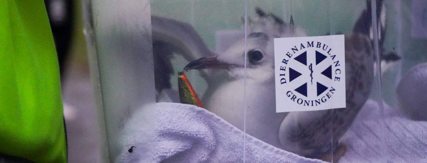 Meeuw zit vast aan vishaak in vijver Oosterhamriklaan