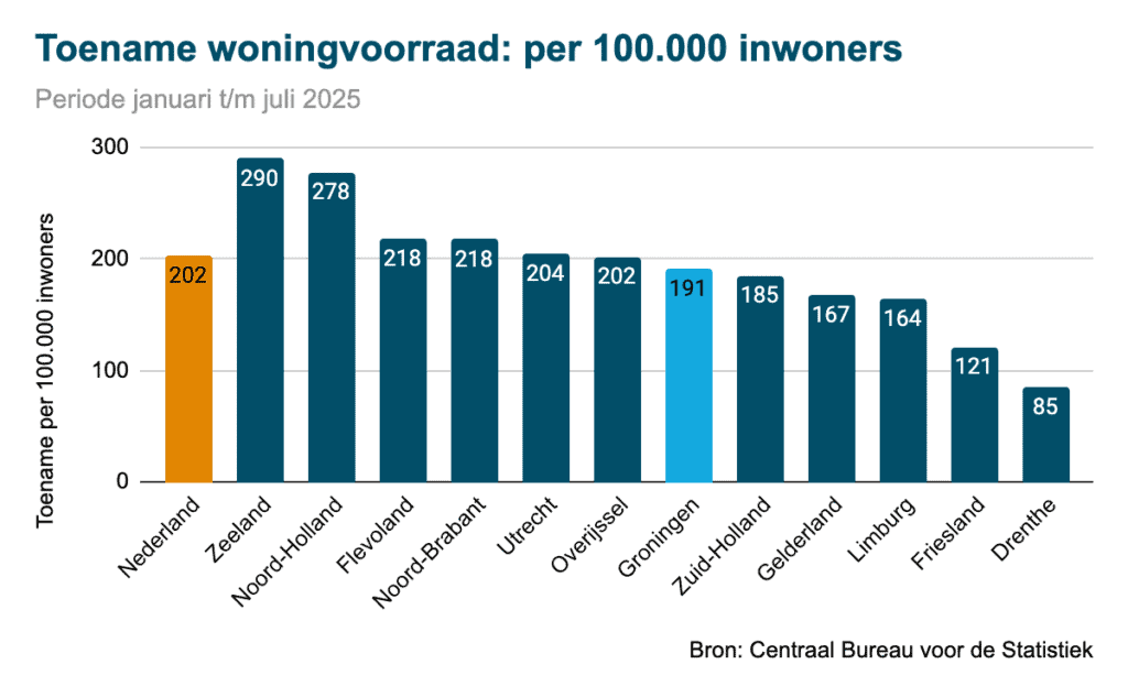 De toename van de woningvoorraad in Groningen is vooral te danken aan nieuwbouw. Opvallend hierin is dat Groningen per 100.000 inwoners de meeste nieuwbouwwoningen heeft toegevoegd van alle provincies. In de eerste zeven maanden van 2025 zijn er 1.678 nieuwbouwwoningen aan de woningvoorraad toegevoegd. Afgezet tegen het aantal inwoners gaat het om 278 woningen per 100.000 inwoners. Dat ligt 37 procent boven het landelijk gemiddelde van 203 nieuwbouwwoningen per 100.000 inwoners.