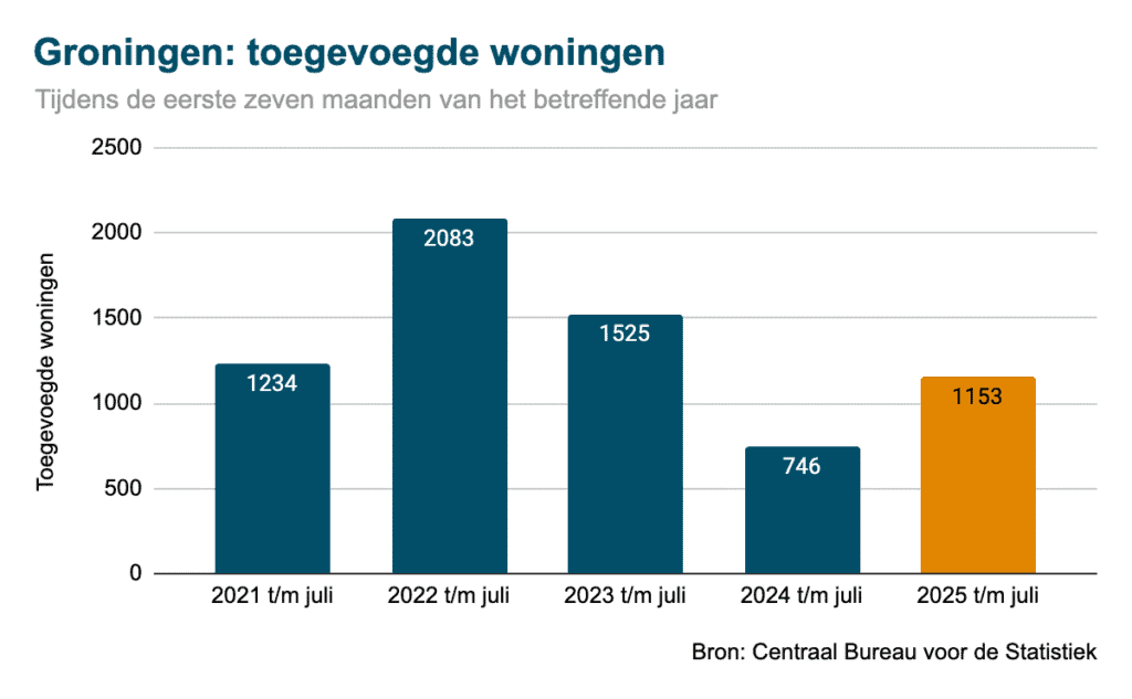 Tijdens de eerste zeven maanden van 2025 zijn er in de provincie Groningen 1.153 woningen toegevoegd. De toename van de woningvoorraad ligt hiermee 55 procent hoger ten opzichte van dezelfde periode vorig jaar. Toen ging het nog om 746 woningen.